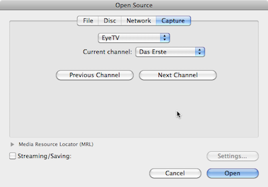 Launch VLC and choose Open Capture Device... from the File menu like here: ![]() Switch to the Capture tab and choose "EyeTV" from its popup menu. Note: If the popup already shows EyeTV but below it it says iSight Capture Input, choose EyeTV from the popup again to get the correct EyeTV panel (it appears to be a little bug in VLC that it shows the wrong panel initially). You should see the following screen: ![]() If you instead see this, then you need to launch EyeTV or install the capture plugin first: ![]() Choose a channel and Open it. Now VLC should show you the Live TV channel, with audio and video. If you have trouble getting VLC to open a EyeTV channel, quit both apps, relaunch EyeTV first and open a live window, then launch VLC and use Open Capture Device... again. Also make sure you explicitly select a channel again from the menu even if it's the one that's currently shown. Seeing stripes in the video when something moves?Make sure you have Deinterlacing enabled, by choosing an option other than "Disable" in the Deinterlace menu under the Video menu. If your computer is powerful enough, choose the bottom one ("Yadif 2x"), which appears to be the best one in VLC. Adjusting audio delay when sound and video are not in syncWhile watching a video in VLC, wait for someone talking or for other activities that allow you to judge when sound and picture are in sync. Now press the f key to decrease the audio delay (which effectively delays the video). You'll see that VLC will show a negative "Audio delay" value, starting at -50ms. Increase this by pressing f more times, or decrease it by pressing g. See if that gets sound in sync with the picture. If not, increase the delay more. You'll have to re-adjust the audio delay every time you switch a channel in VLC. |